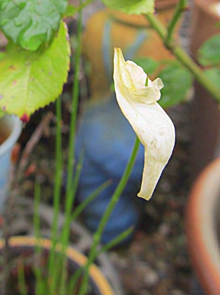 Weil die, von allein dort fußgefasste, Binse wusste, dass sie keine Blumenbinse war und blütentechnisch mit den nebenan stehenden Rosen nicht mithalten kann, spießte sie einfach ein Rosenblatt auf und steht nun stolz, als außergewöhnliches Binsenexemplar, zwischen den bunten Blumen. Sie konnte ja nicht wissen, dass sie auch ohne dieses spektakuläre Blüte hätte bleiben dürfen. Mini-Kübelteiche liegen im Trend. Bei dem vielen Wasser von oben ist es nicht verwunderlich, dass Binsen sogar in Blumenkübeln gedeihen. Töpfe ohne größere Abflusslöcher müssen fast täglich geleert werden. Eine längere trockene Phase wäre jetzt wieder schön, schon allein damit die Wiese mal gemäht werden kann.