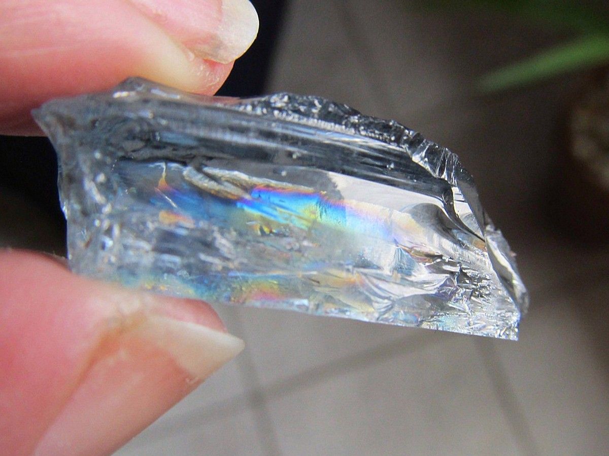 Ein Spaziergangsfunstück - mitten auf einem Feldweg lag diese dicke Glasscherbe. Wenn ich sie ins Licht halte, funkelt sie in allen Regenbogenfarben. Ich denke es ist eine Verbundglasscheibe, vielleicht von einer Landmaschine die Frontscheibe, denn sie ist ziemlich dick oder es ist eine Scheibe von einem Baufahrzeug.