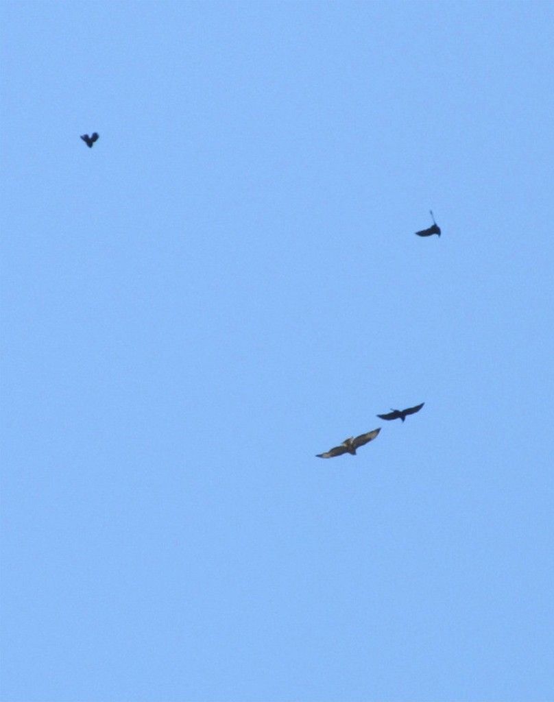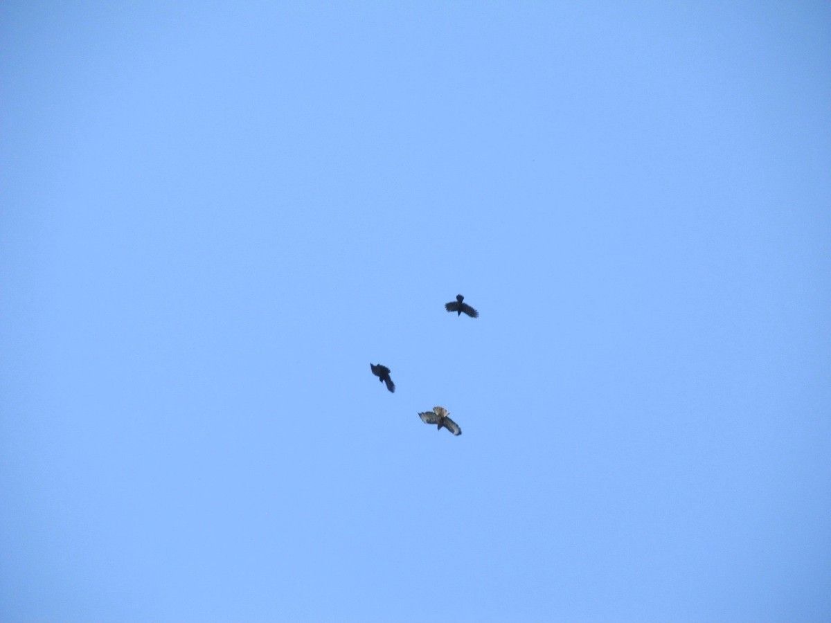 Sie fliegen hefige Attacken und am Ende sind es vier Krähen die den Bussard immer wieder mit gewagten Manövern angreifen. Das ist ihm zuviel und er dreht ab, um sich ein leichteres Opfer zu suchen. Arterhaltungsinstinkt oder Familiensinn?