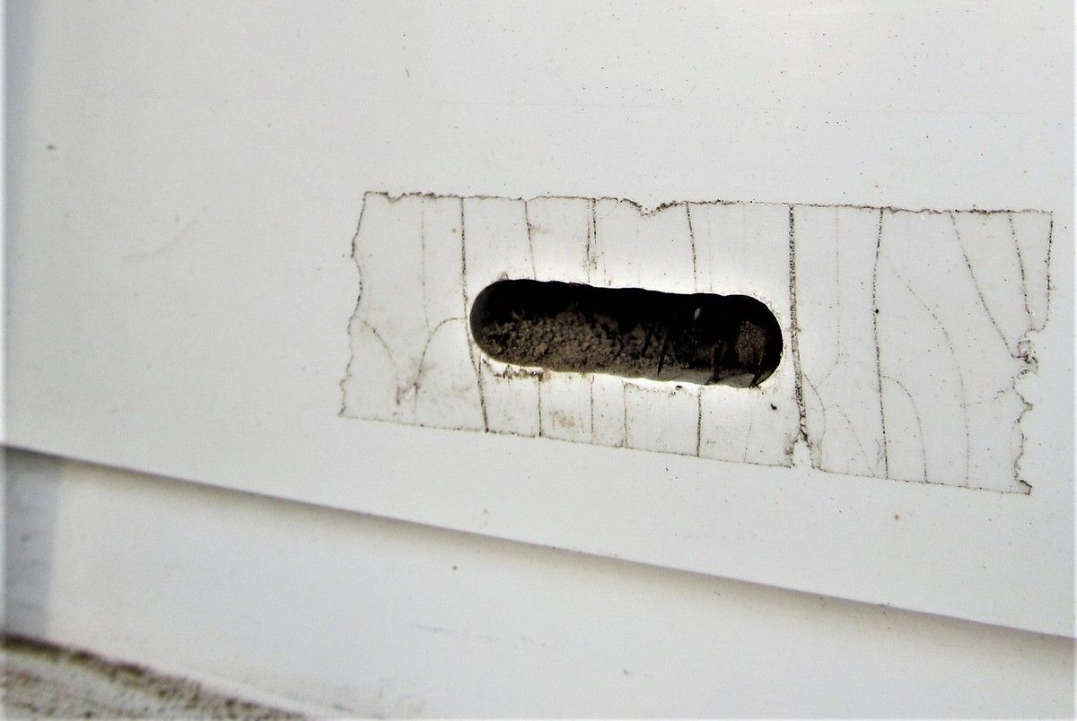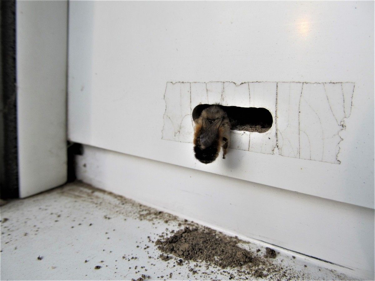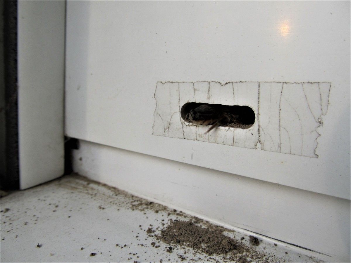 Ich war/bin zu spät dran im Jahr. Normalerweise klebe ich die Lüftungslöcher in den Fensterrahmen ab, um Besiedelung zu verhindern. Man sieht es, die Reste des Klebestreifens vom Vorjahr kleben noch am Rahmen. In diesem Jahr war ich zu spät oder die Wildbienen zu früh. Wer braucht denn schon ein gekauftes Wildbienenhotel, wenn die Fensterrahmen Lüftungslöcher haben?
