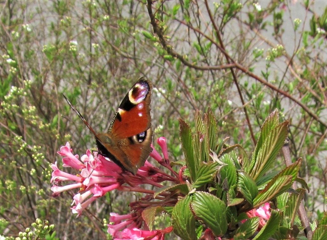 Seit dem Wochenende flatterte das Tagpfauenauge über der Wiese herum. Hier und da machte es halt und breitete seine Flügel weit aus, vermutlich um so einen potentiellen Partner auf sich aufmerksam zu machen. Heute war es dann soweit, plötzlich flatterten sie zu zweit, immer höher in den Himmel steigend, umeinander.