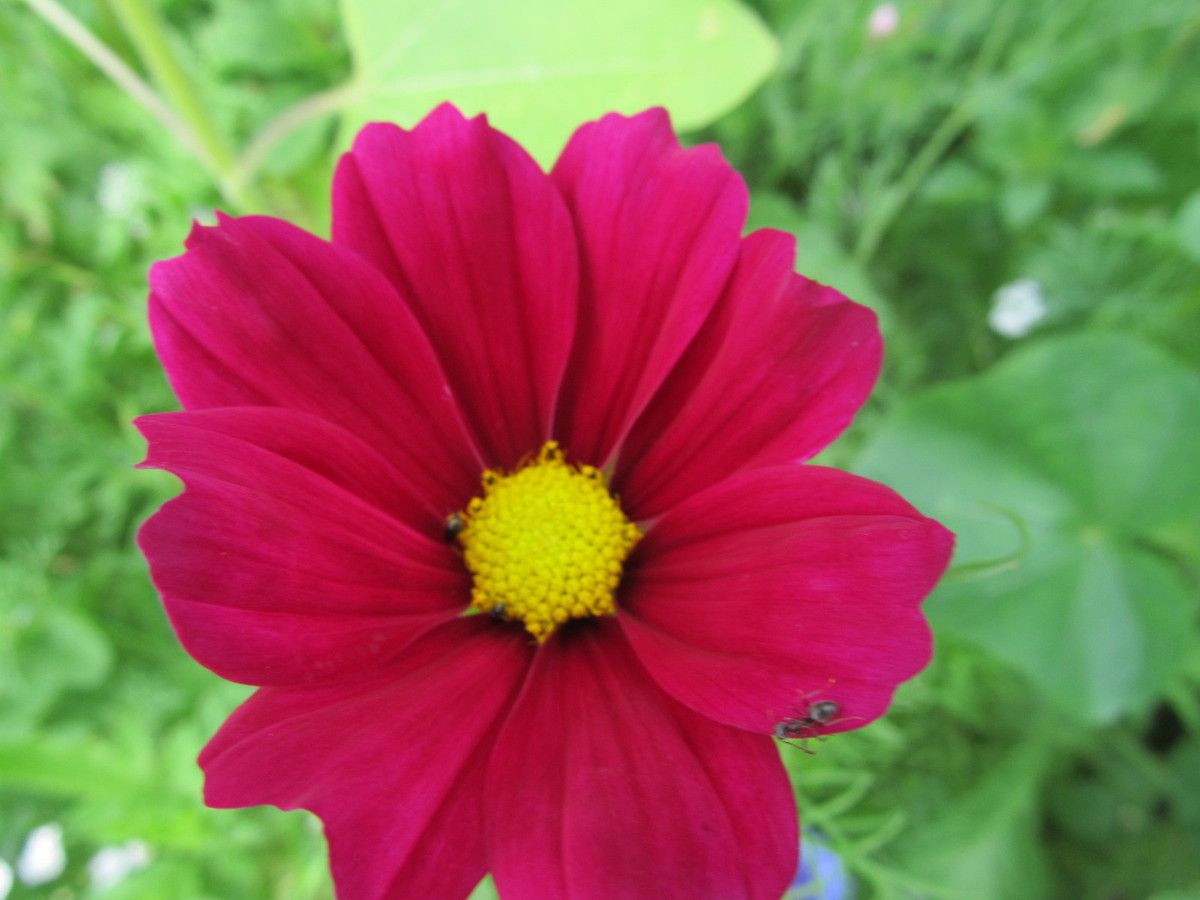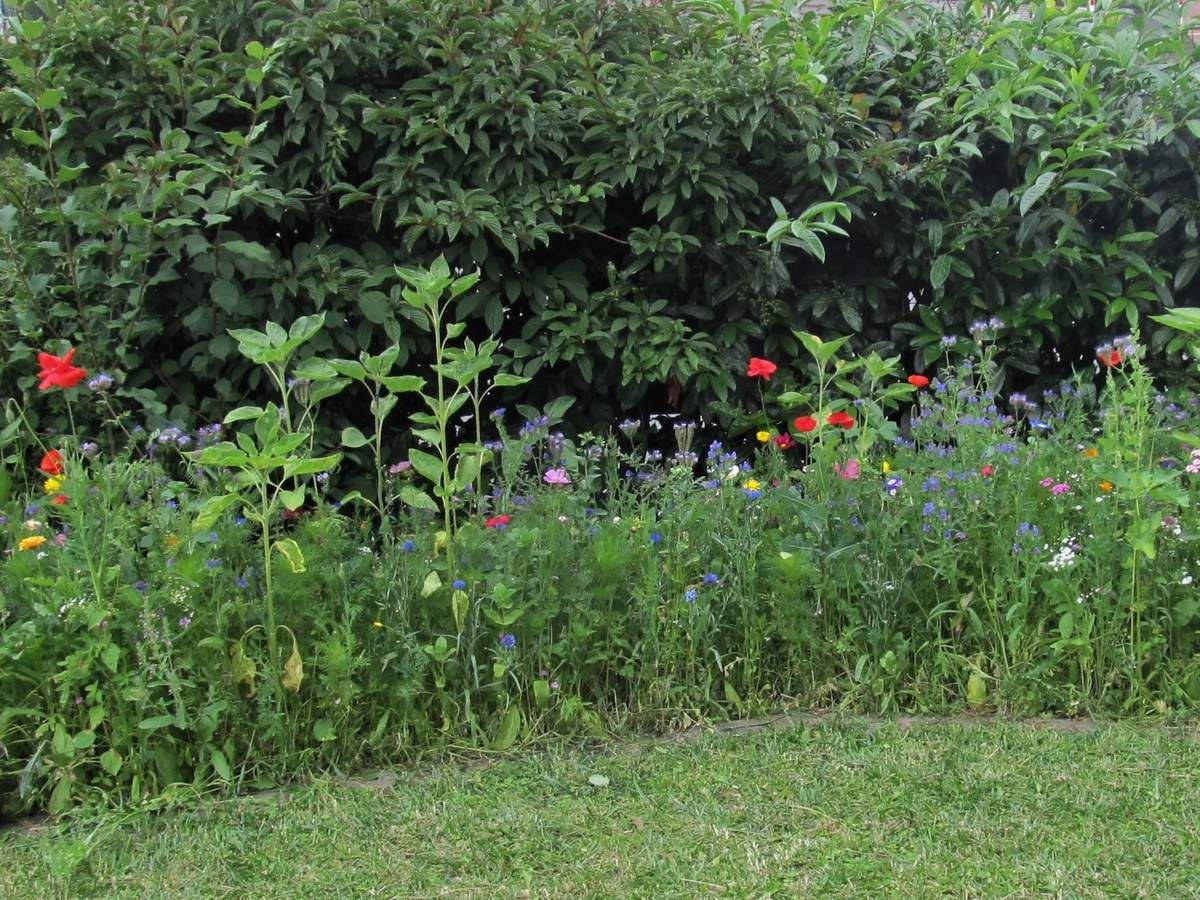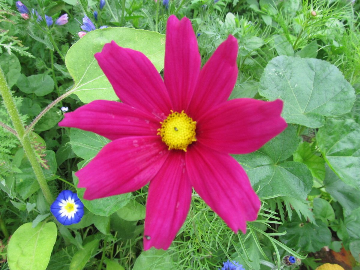 Eine Vielzahl von Blüten stehen in der Blühwiese, eine davon ist die Cosmea, das Schmuckkörbchen. Ihr leuchtendes Pink sticht heraus.