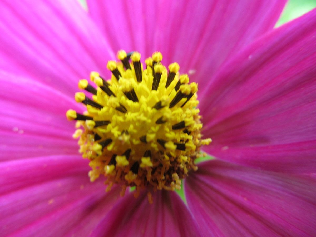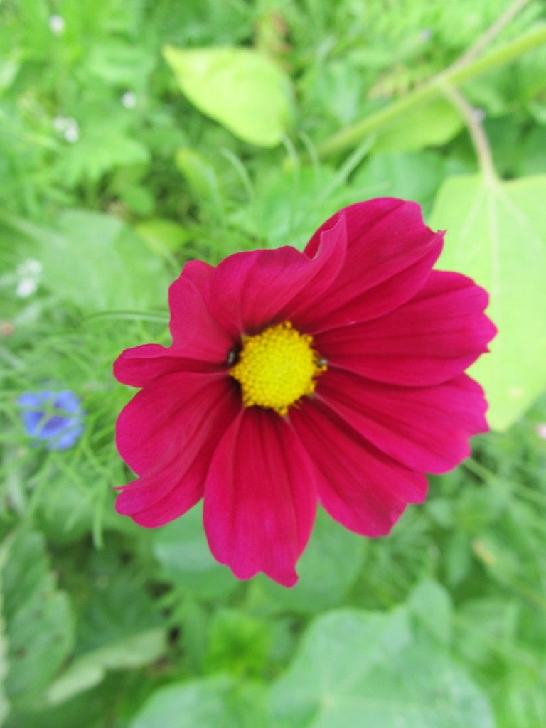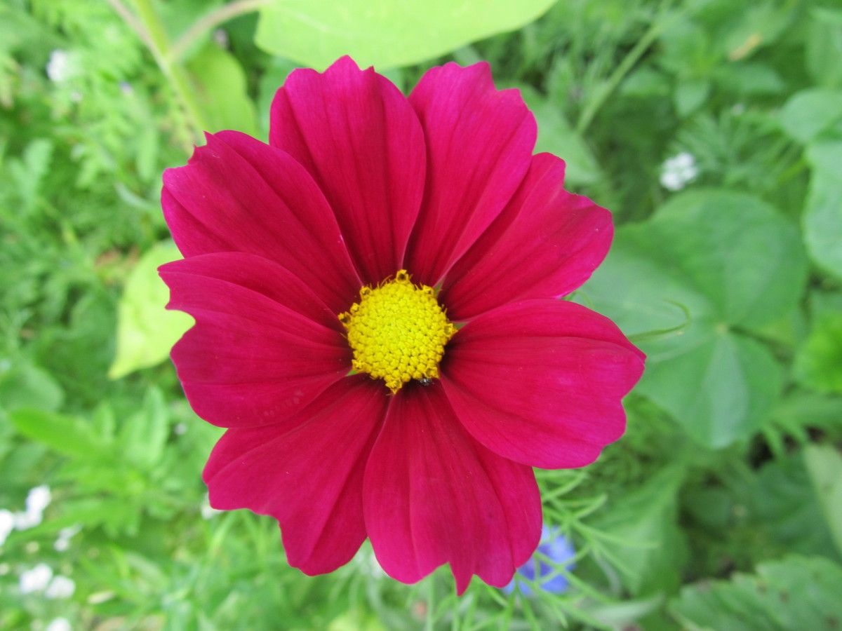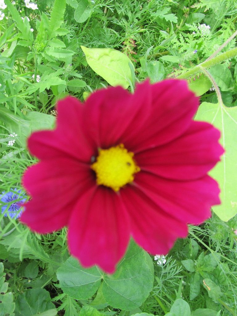 Eine Vielzahl von Blüten stehen in der Blühwiese, eine davon ist die Cosmea, das Schmuckkörbchen. Ihr leuchtendes Pink sticht heraus.