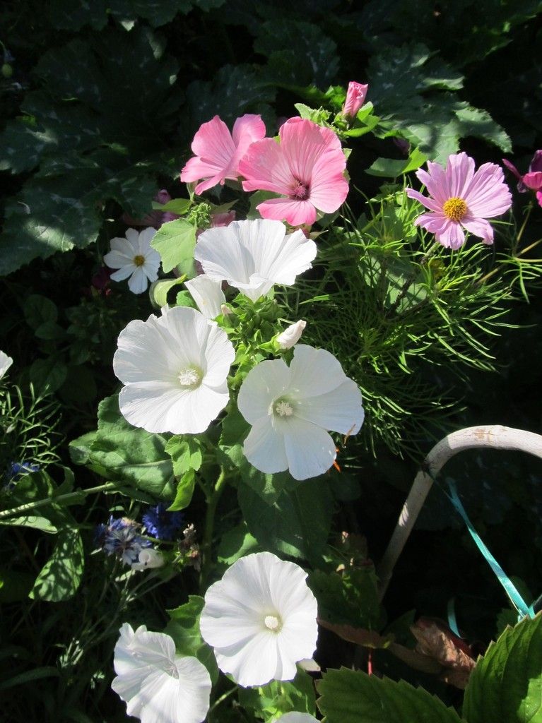 Malven in der Wiese Veröffentlicht auf 22. Juli 2018 von Szintilla Malven rosa und weiß Werbung Vieles in der "wilden" Wiese ist verblüht,was jetzt noch besonders leuchtet sind die weißen und rosa Malven. Ein paar Kornblumen habe ich noch entdeckt, ein paar Jungfern im Grünen,selbst ein paar Mohnblumen blühen noch. Malven