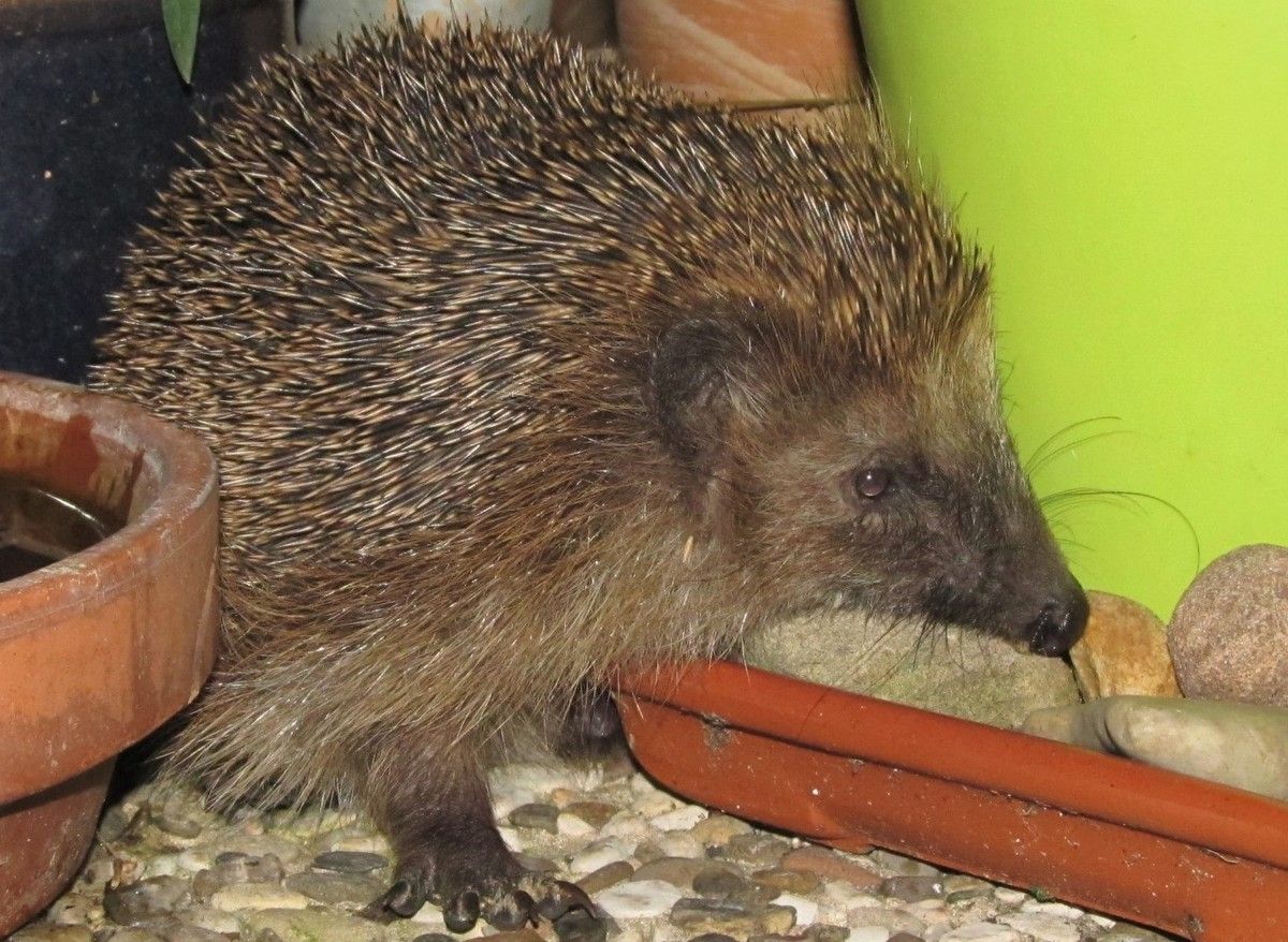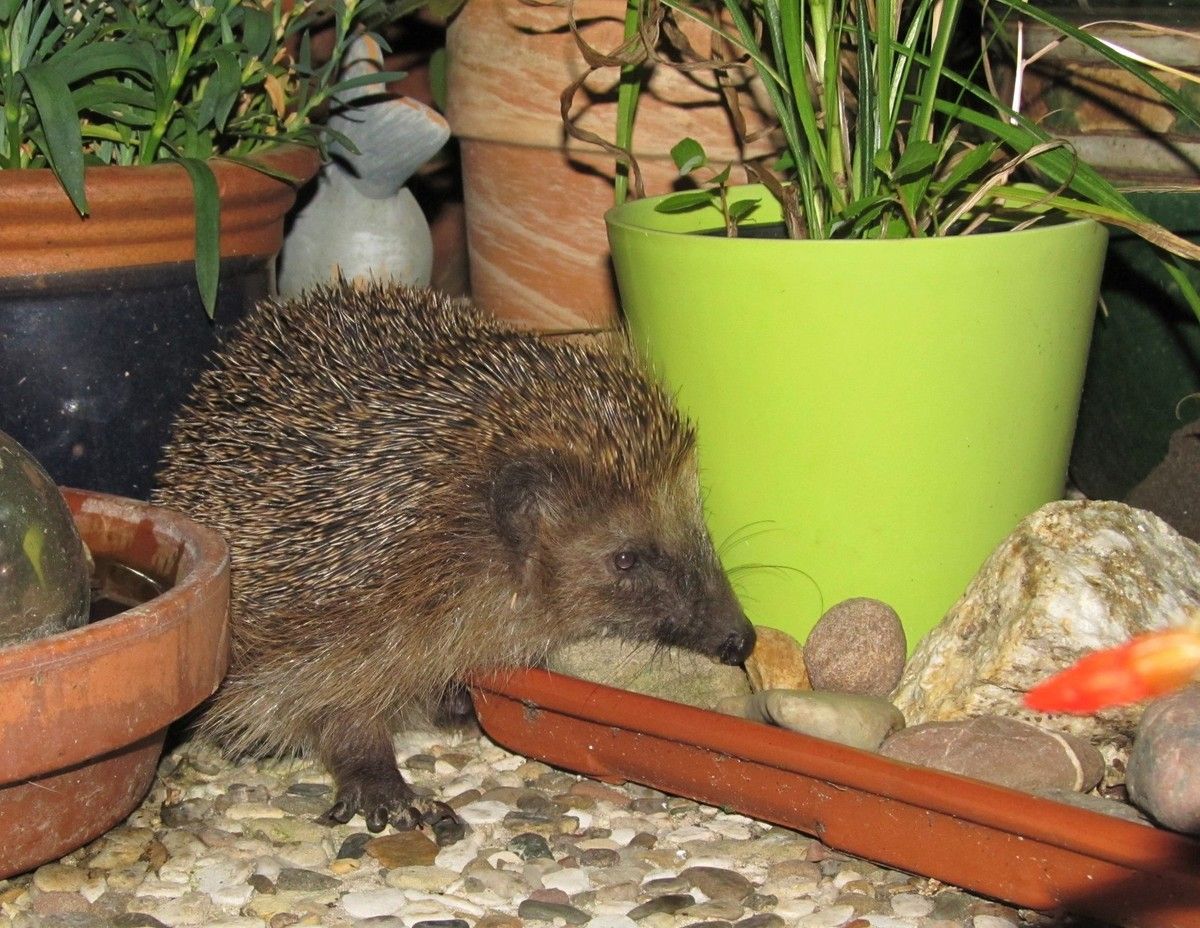 Von all dem weniger beeindruckt war das Stachelpelzchen, das sich den Garten mit mir teilen musste und laut polternd, wie ein Elefant im Porzellanladen, über meine Steindeko stieg und dabei den grünen Blumentopf mit der grade blühenden Prachtscharte umpfefferte. Jetzt weiß ich wenigstens warum ich den Topf an so vielen Morgenden immer wieder aufstellen muss. Es ist nicht der Wind, das himmlische Kind, der dafür verantwortlich ist, wie ich dachte sondern das Stachelpelzchen, das auf den Fotos so unschuldig guckt und sich an die Steine schmiegt. Das war bevor er mit dem Blumentopf kegelte, danach suchte er ziemlich zügig das Weite. Ebenso wie der Igel teilten der Steinkauz auf dem Nachbardach und die Fledermäuse, die um die Laterne flatterten (und die Insekten dezimierten) die Nacht mit mir.