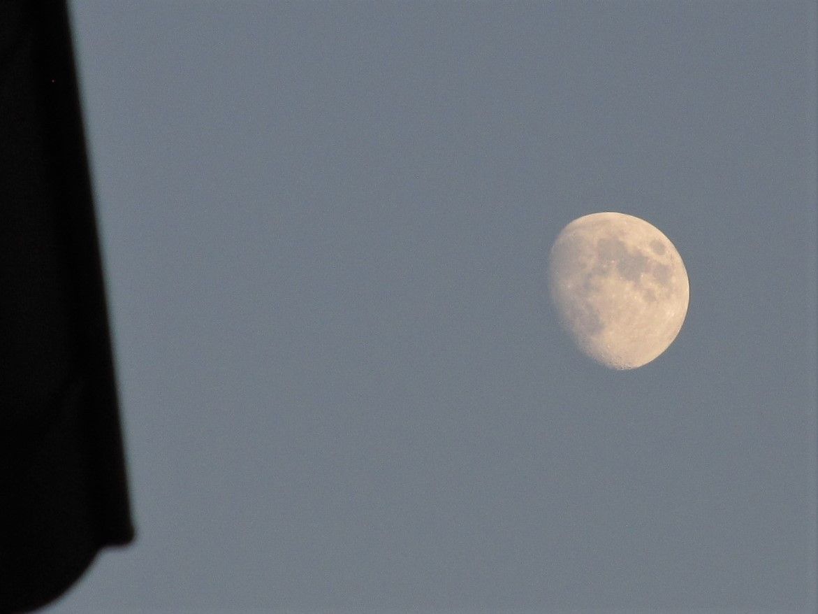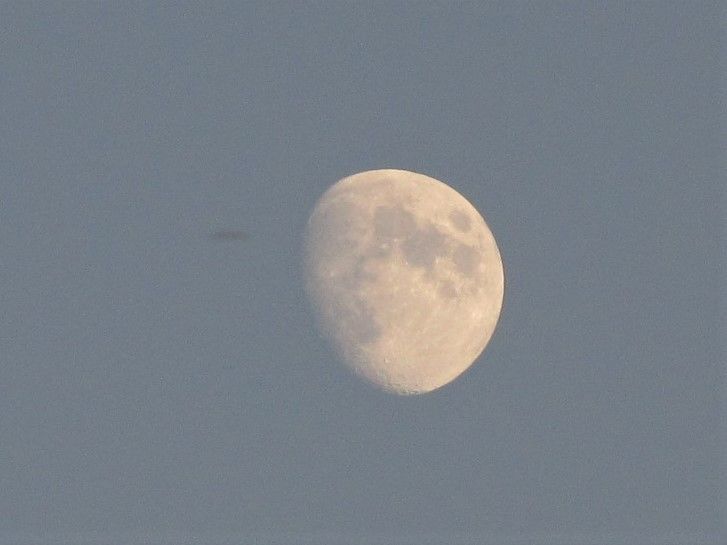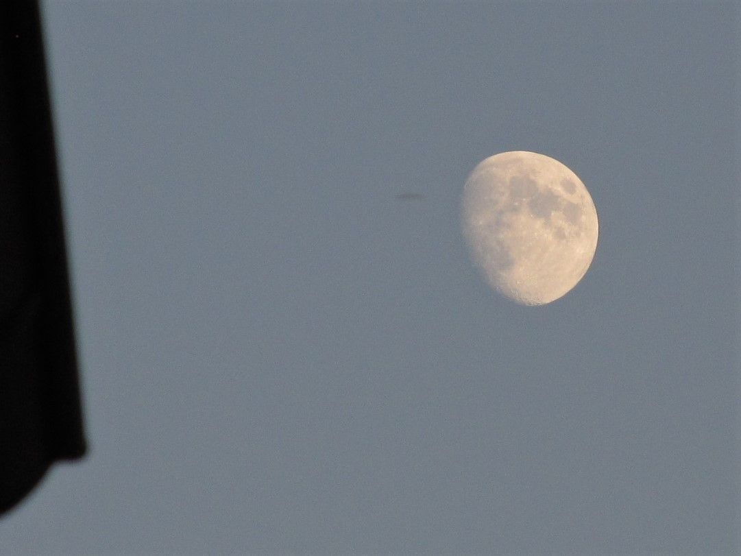 Ein Mondaufnahme gegen 21:30 Uhr (am noch blauen Himmel) gemacht, zeigt einen Flecken links oben neben dem Mond. Bei der nur einige Senkunden später gemachten Aufnahme ist der Fleck nicht mehr da, demnach scheidet ein Flecken auf dem Objektiv aus.