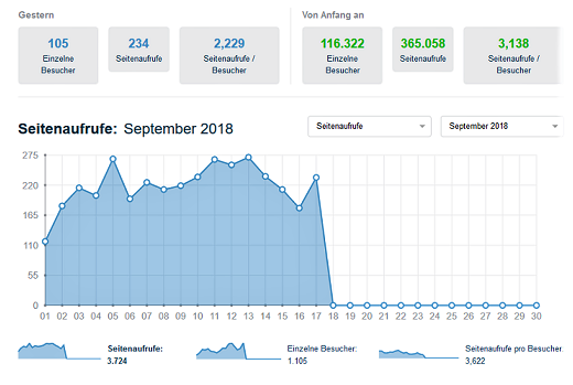 Heute nehme ich euch einmal mit in die Interna des Blogs, denn ich beobachte jedes Jahr in der zweiten Jahreshälfte einen signifikanten Besucheranstieg. Während des ersten Halbjahres belaufen sich die täglichen Besucherzahlen durchschnittlich zwischen 15-20 Besuchern täglich, das werden zum Großteil meine Follower sein. Aktuell 34 an der Zahl. Nach den Sommerferien steigt die tägliche Anzahl der Blog-Besucher drastisch an. Dieser Trend hält meistens bis in den Dezember. So sieht das dann in der Statistik des Blogs aus.