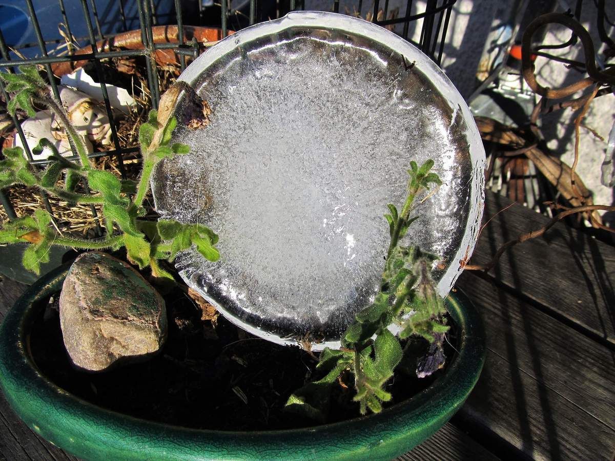 Die Eisscheiben dienen als langsames Bewässerungssystem für einige Pflänzchen. Gartenart - Winterzeit. Das sind übrigens immer noch Petunien, die auch immer noch - trotz Nachtfrost - grün sind.