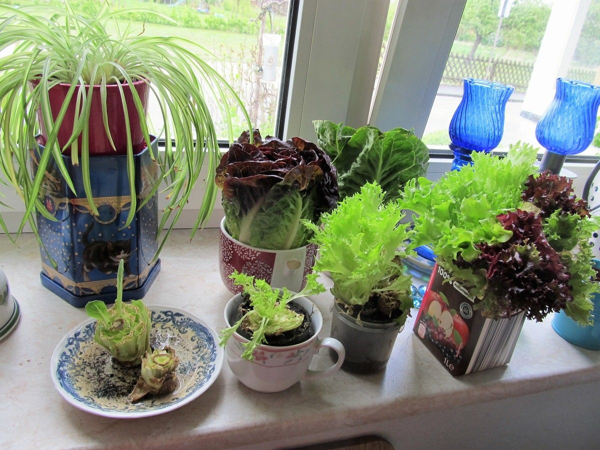 Als die Temperaturen es noch nicht gestatteten die gewurzelten Salatstrünke nach draußen in die Erde zu geben, kamen sie in recycelte Saftkartons in Erde. Mittlerweile sind sie ins Freibeert umgezogen. Im Hintergrund in den Tassen stehen frisch gekaufte Salatherzen, die bei mir auch immer sofort in eine Tasse mit ein bis zwei Zentimeter Wasser kommen. Ein winziger Schluck Apfelessig und eine Spur Zucker dazu und der Salat bleibt länger frisch. Wird er nicht sofort verbraucht, bekommt er so auch schon Gelegenheit Wurzeln zu treiben.