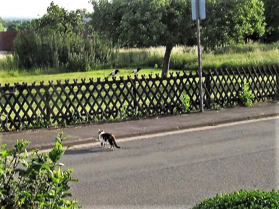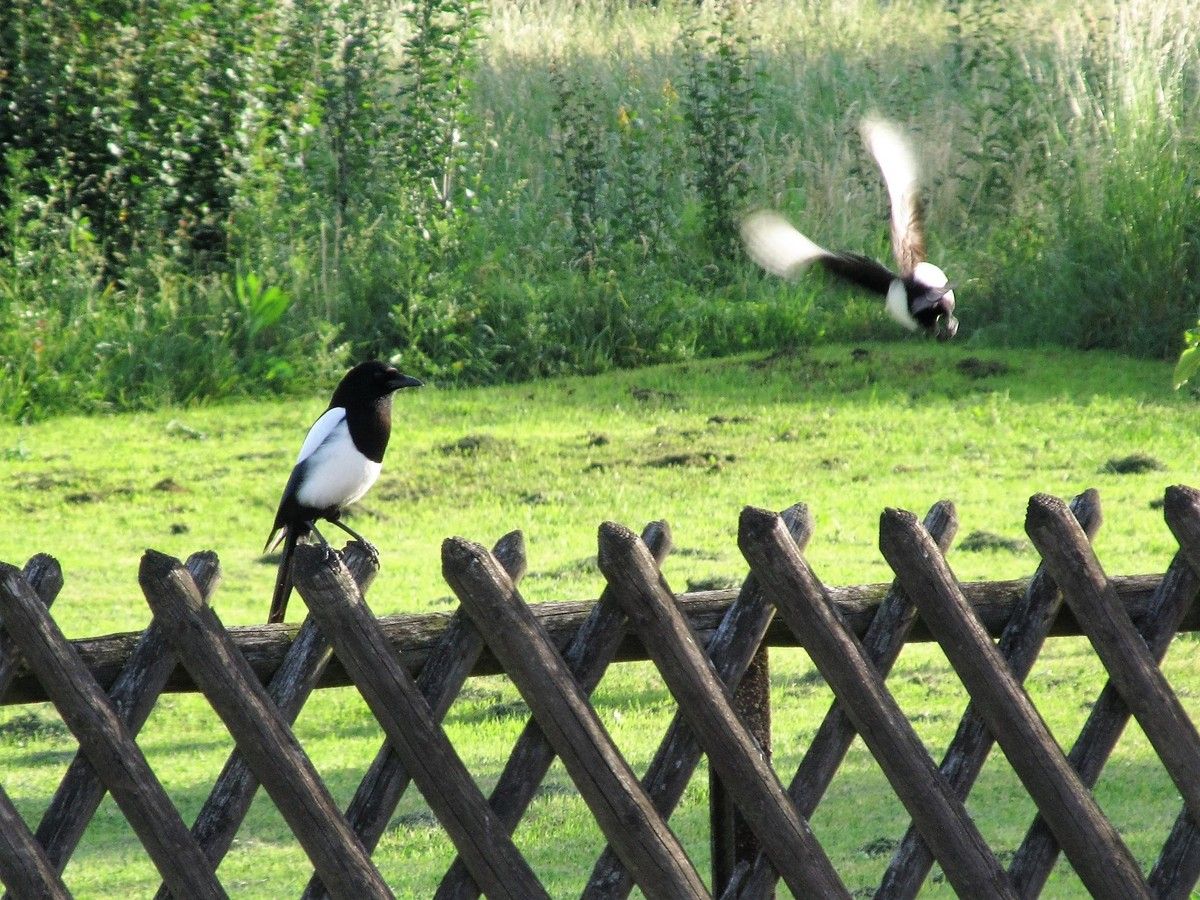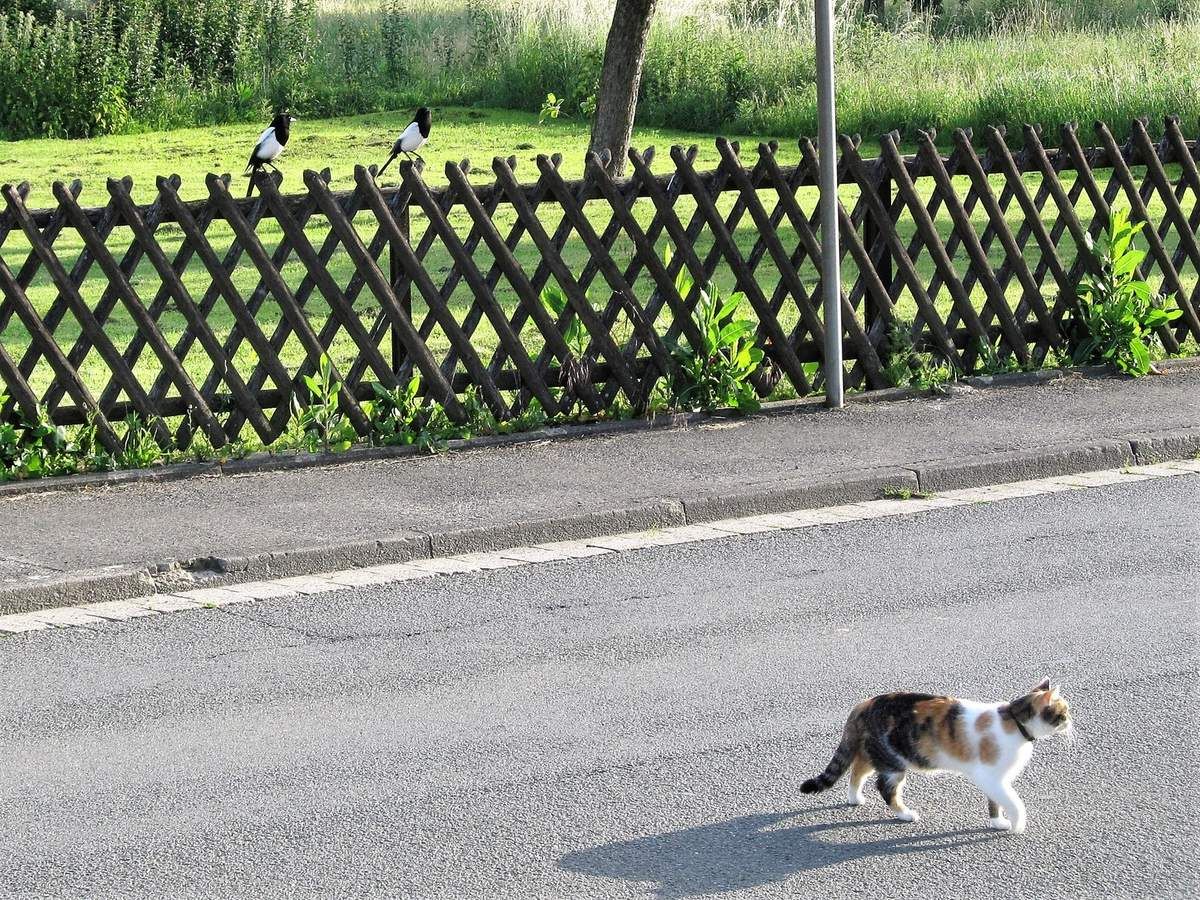 Tierisch, tierisch. Das Elsternpaar hat drei Jungtiere und alle Schnäbel voll zu tun. Manchmal sitzen sie auf dem Zaun, als würden sie überlegen, was als nächstes zu tun sei. Gelegentlich kommt ein Felltiger vorbei und überlegt ebenfalls, nämlich ob er sich mit den Schwarzweißen anlegen soll oder lieber nicht.