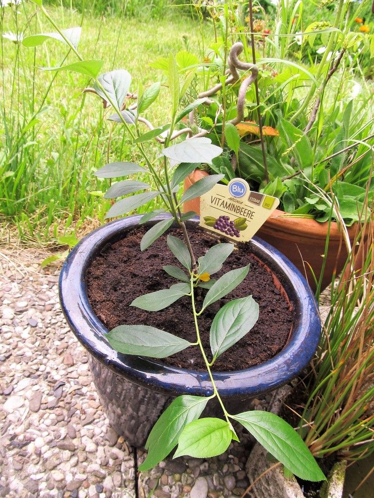 Ein Neuankömmling im Garten, die Vitaminbeere, der Aroniastrauch, neben der Gojibeere vom vergangenen Jahr - die allerdings schwächelt - ein neues Superfood im Naschgarten.Die Gojibeere soll erst im dritten Jahr nach der Umpflanzung an einen neuen Standort Beeren tragen. Ich muss mich noch ein Jahr gedulden, bevor ich überhaupt etwas von ihr erwarten kann. Ich wäre ja schon glücklich, wenn ein neuer Trieb käme, dem ist aber nicht so.