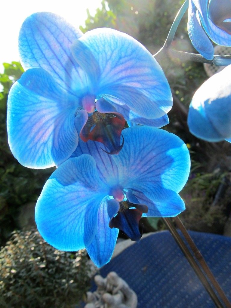 Ich habe die Schöne mittags kurz nach draußen in die Sonne gestellt, um sie besser fotografieren zu können. Die Fensterbank ist immer ein undankbarer Platz dafür. Ich frage mich jetzt, ob sie dieses wunderbare Blau später auch noch in einer Blüte zeigt oder ob hier auch nur mittels Veränderung nachgeholfen wurde. So kann man beispielsweise aus einer weißen Rose in einer Vase eine blaue machen, in dem man ihr Tinte statt Wasser zu trinken gibt. Ich gehe aber nicht davon aus, das diese Orchidee mit Tinte gegossen wurde. Dennoch - trotz Manipulationsverdacht - konnte ich einfach nicht daran vorbeigehen und sie stehen lassen, denn sie sieht zauberhaft aus. Aber ich bin sehr sicher, dass hier manipuliert wurde und sie bei der nächsten Blüte nur noch weiß blühen wird.