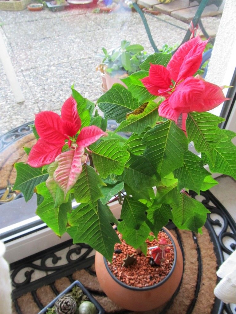Im vergangenen Dezember 2018 kam ich unerwartet zu einem Christstern. Ich habe ihn gepflegt und gehegt, weil ich ihn in diesem Jahr wieder zur Blüte bringen wollte, was ich bisher noch nie schaffte. Also hieß es recherchieren und schauen was ich falsch gemacht hatte, um es diesmal richtig zu machen. Den ganzen Sommer verbrachte er ziemlich unbeachtet draußen auf der Terrasse, nur gelegentlich schaute ich, ob die Erde noch feucht war. Aber dann, ab September wurde er hofiert. Dünger und Licht mussten optimiert werden. Gedüngt wurde er mit Tee, alle zwei Wochen bekam er den zweiten Aufguss eines Teebeutels. Ab Oktober wurde das Licht reduziert, das heißt er durfte nie mehr als 12 Stunden Tageslicht bekommen, die übrigen 12 Stunden musste es um ihn herum stockfinster sein sonst bilden sich keinen roten Hochblätter aus. Also trug ich den Topf jeden Abend um 22 Uhr in die Gästetoilette, die ist fensterlos und stockfinster und holte ihn erst an nächsten Tag nach zehn Uhr wieder auf die Fensterbank. Oft vergaß ich ihn auch und er kam erst am mittag wieder ans Licht. Das Ergebnis kann sich sehen lassen. Zwar ist er nicht so üppig und so hochgezüchtet wie die jetzt in den Geschäften verkauften Exemplare, aber ich bin mit dem Ergebnis durchaus zufrieden. In diesem Herbst wird er schon ab September dunkel gestellt werden, denn ich glaube, ein bisschen mehr Zeit zur Bildung der roten Hochblätter hätte ihm gut getan. So sieht mein auch hochgeschossenes Fundstück vom letzten Jahr jetzt aus. Er leuchtet ganz ohne Glitzer.