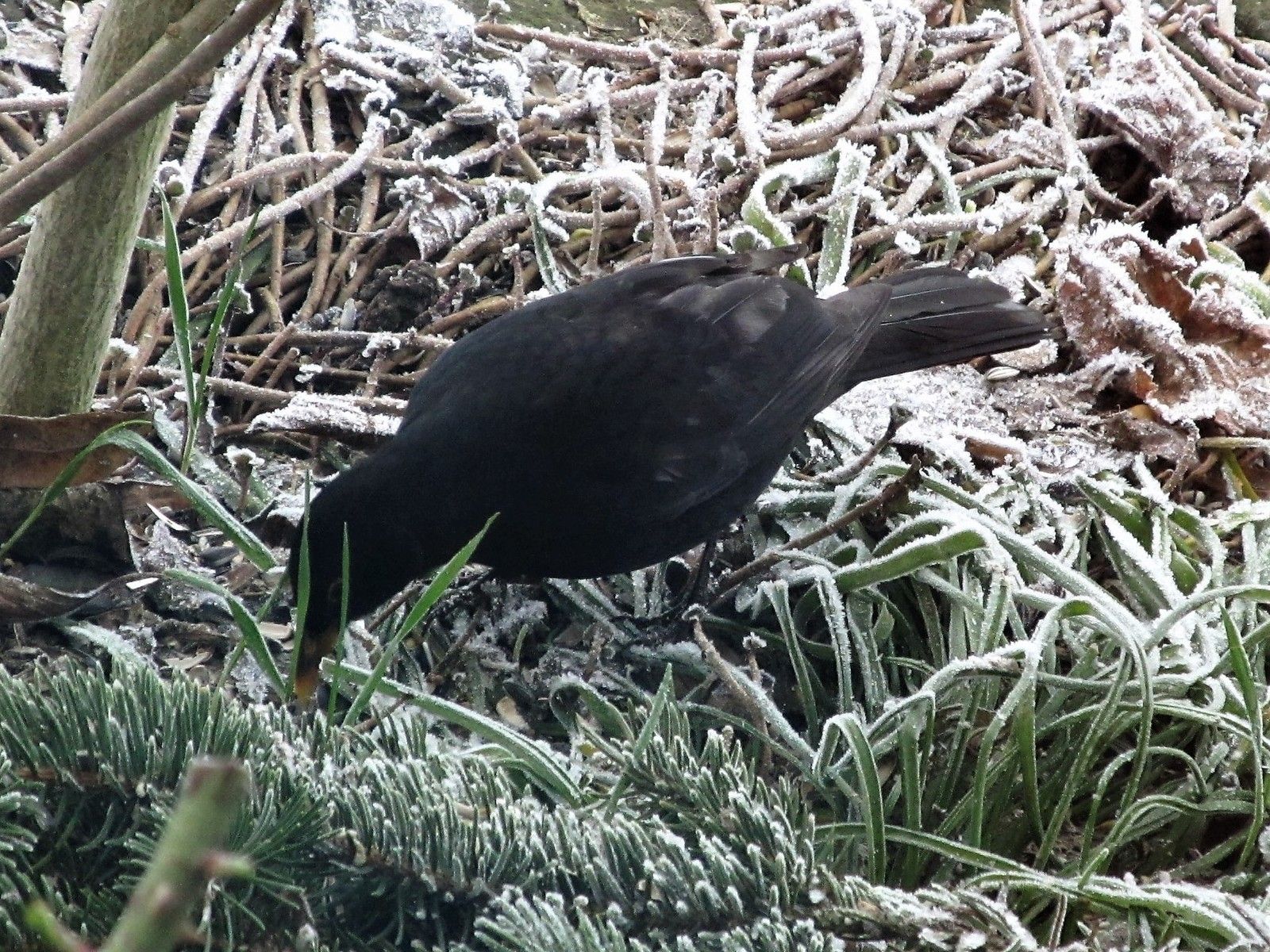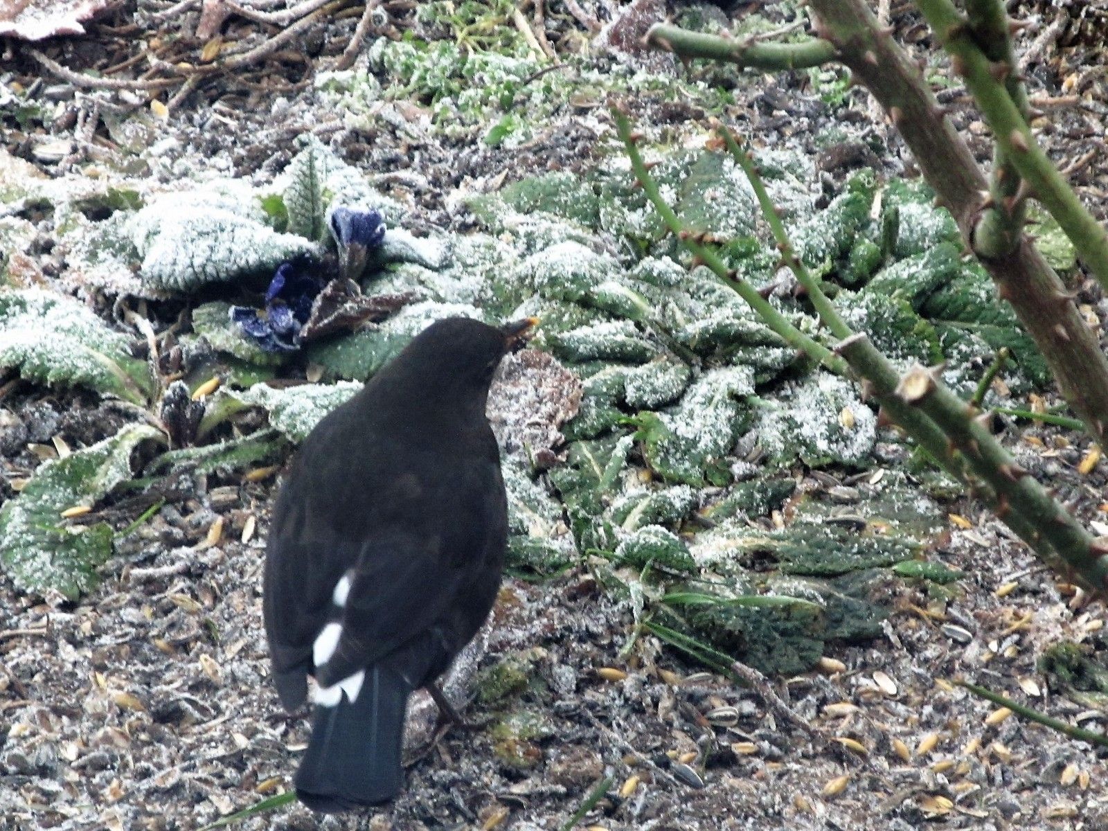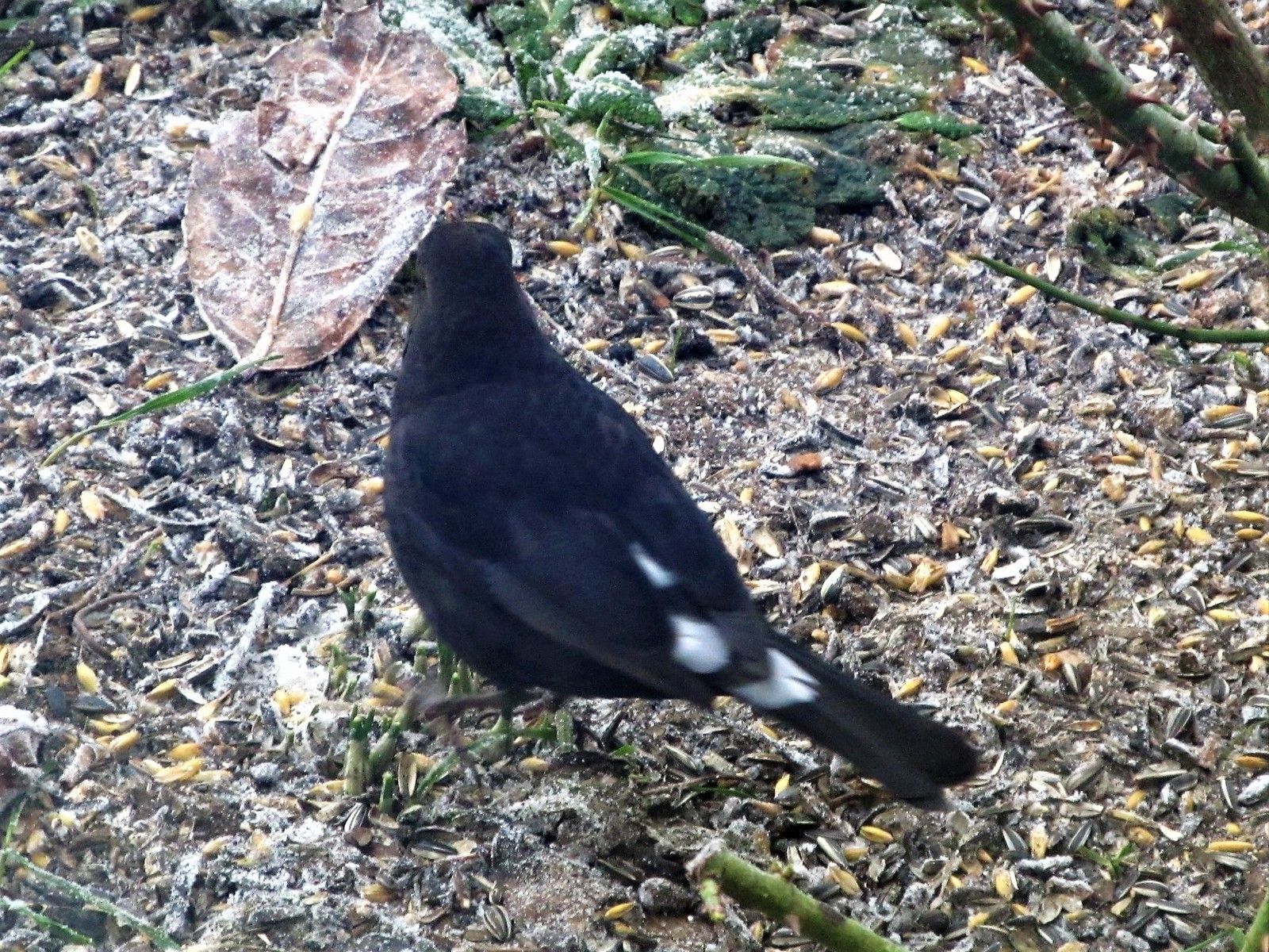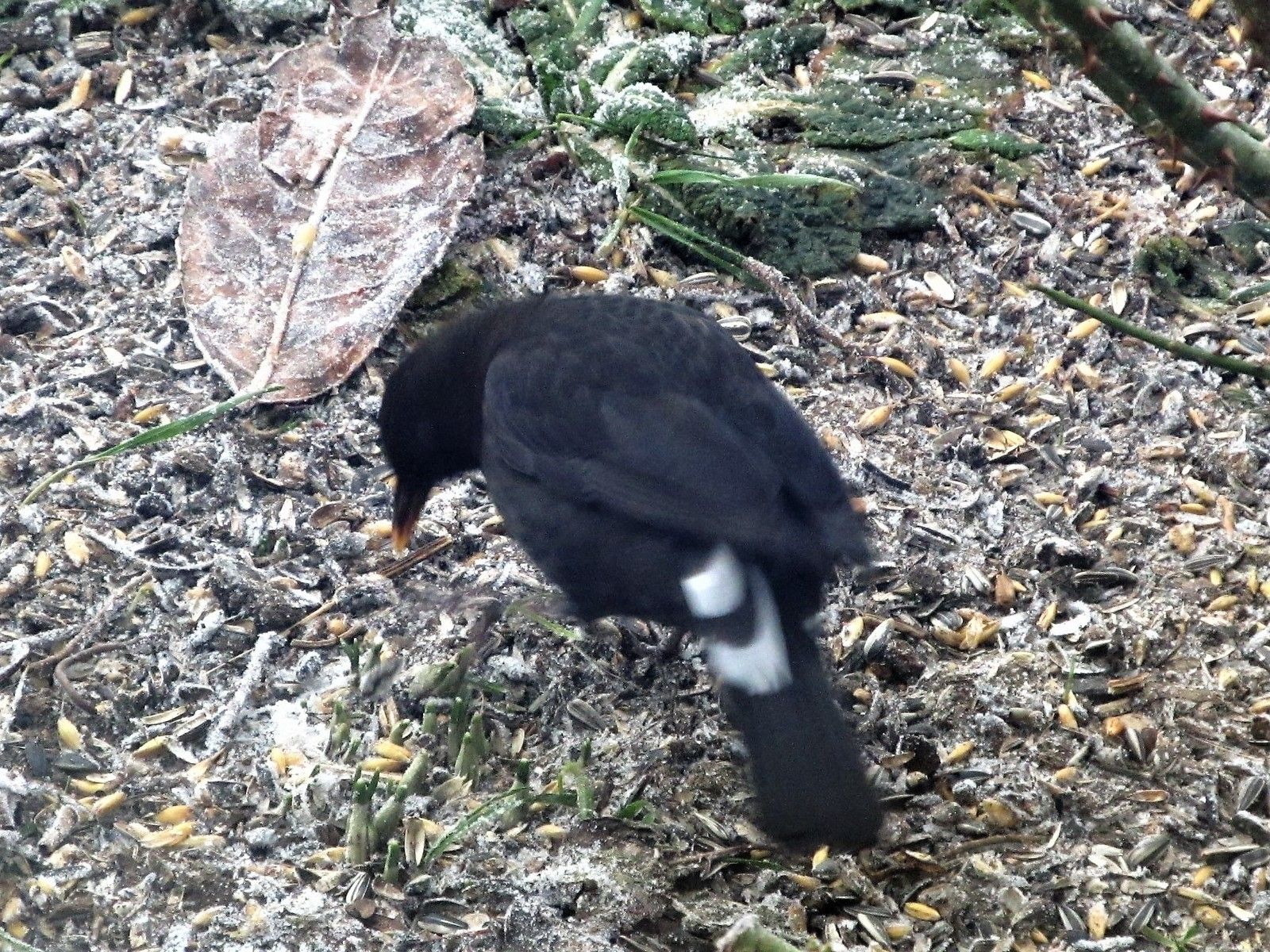 Am Futterhaus sehe ich neuerdings Amseln mit Farbmutationen. Es sind zwei Männchen, eine hat reinweiße Federn auf dem Rücken, die andere blass graue runde Flecken im Federkleid.