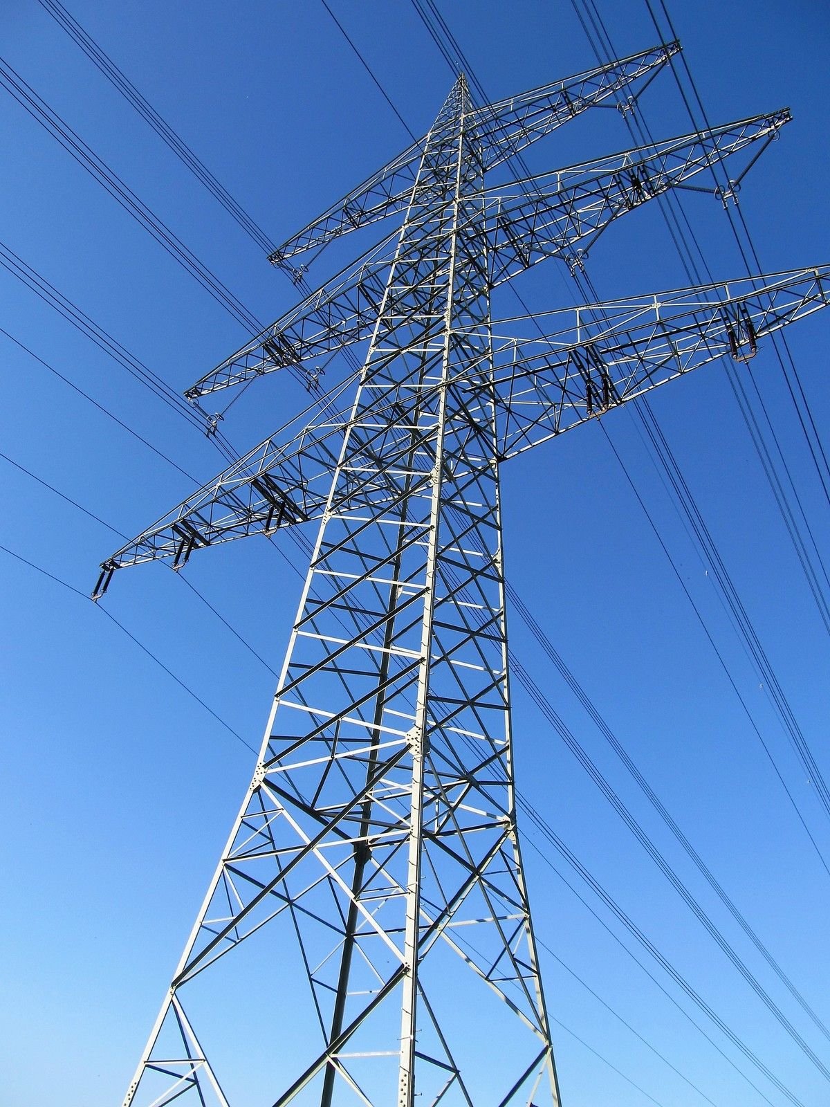 Einen starken Kontrast bildet der extrem blaue Himmel und das nackte Metall des Strommasten.