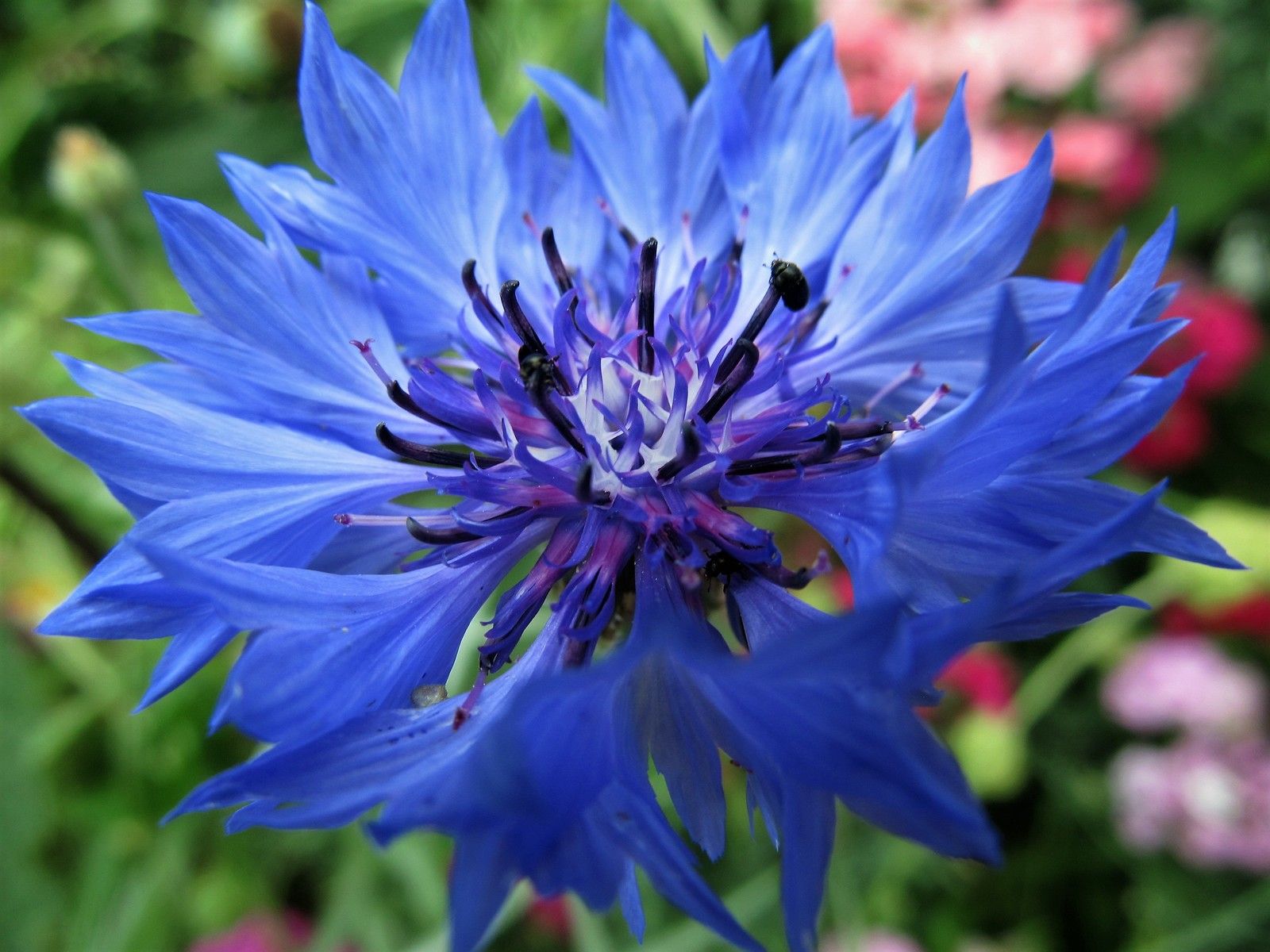 Zwischen all dem Bunt meiner wilden Wiese, tauchen immer wieder Kornblumen auf. Aus der Nähe betrachtet sind es kleine, leuchtendblaue Schönheiten.
