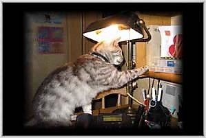 Obwohl es wettertechnisch deutlich wärmer wurde, ist es meinen Katzen scheinbar zu kalt. Mit Vorliebe lassen sie sich das Gehirn kochen. Oft sitzen sie dösend in unterschiedlichen Positionen auf dem Tisch unter der Schreibtischlampe. Wenn sie so weitermachen gibt es irgendwann angebrannte Katzenöhrchen, Schmorhirn oder Brandings. Spätestens wenn beginnt Rauch aufzusteigen, werde ich den Feuerlöscher bereit stellen..., man kann ja nie wissen...